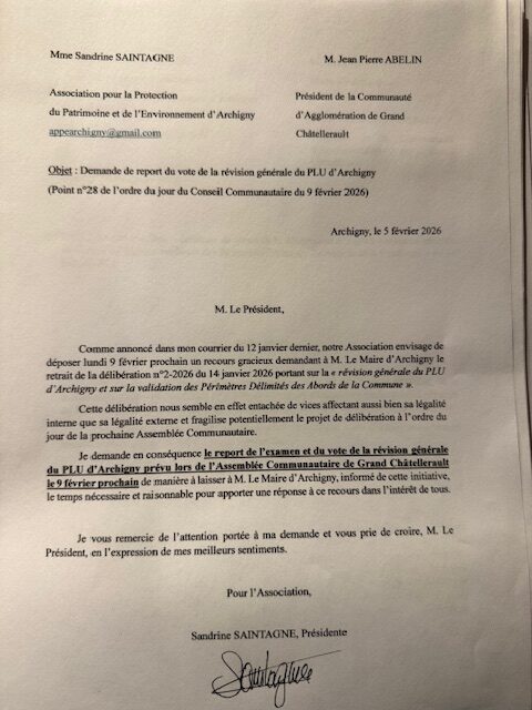 Communiqué du 10 avril 2025Télécharger Communiqué du 24 octobre 2025 Abbaye de l’EtoileTélécharger Courrier du 6 mai 2025 à AuddicéTélécharger Courrier du 11 juin 2025 maire ArchignyTélécharger Courrier du 25 juin 2025 Grand ChâtelleraultTélécharger Courrier du 8 décembre 2025 Franck BonnardTélécharger Courrier du 12 janvier 2026 à Grand ChâtelleraultTélécharger Courrier du 5 février 2026 Grand ChâtelleraultTélécharger Communiqué du 8 février 2026Télécharger Communiqué du 15 Janvier 2026Télécharger Courrier du 9 février 2026 Maire d’ArchignyTélécharger Communiqué du 1er mars 2026Télécharger